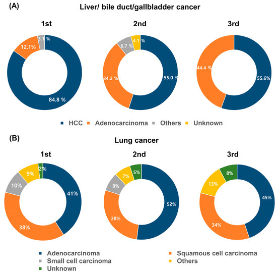 Pathologic diagnosis of first, second, and third primary cancers: (A) Pathologic types of liver/bile duct/gallbladder cancer. (B) Pathologic types of lung cancer. Abbreviations: HCC, hepatocellular carcinoma.