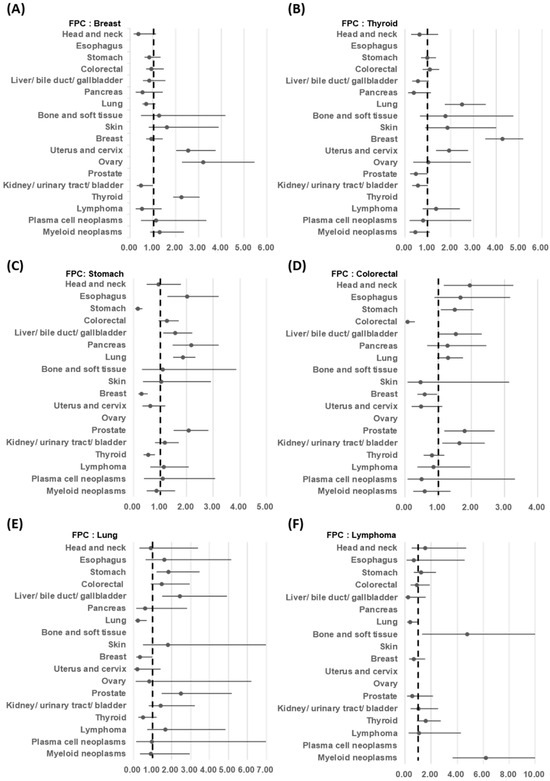 Relative risks for specific second primary cancers among patients with first primary breast cancer (A), thyroid cancer (B), stomach cancer (C), colorectal cancer (D), lung cancer (E), and lymphoma (F).