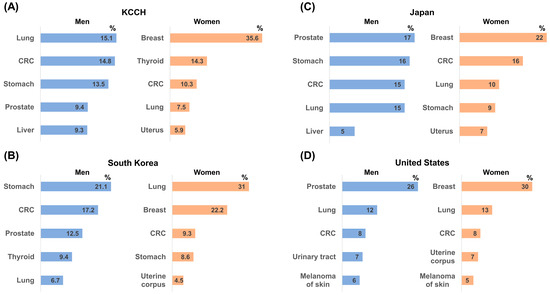 Comparison of cancer prevalence in 2021: (A) KCCH; (B) South Korea [11]; (C) Japan [12]; (D) United States [13].
