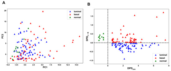 A failure of PCA to separate cell states and their robust separation by cSTAR. (A) PCA fails to separate different cell states for CYTOF dataset of 61 BC and 5 non-malignant breast epithelial cell lines growing in serum. (B) cSTAR separation of cell states for different BC types (red and blue triangles) and normal breast epithelial-derived lines (green triangles) in the DPDonc and DPDL-B space. The DPD scores equal to zero correspond to the separating hyperplanes (shown by dashed lines).