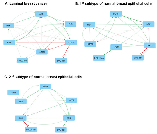 Consensus networks constructed for the late time points and containing both signaling modules and the DPD phenotypic modules. Activation and inhibition are indicated by green arrowheads and red barheads, respectively. The darker the color, the higher the absolute value of the connection coefficient. (A) Luminal breast cancer cell lines. The first subtype (B) and the second subtype (C) of normal breast epithelial derived cell lines.
