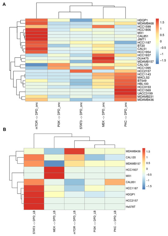 Although each luminal BC cell line has a specific core network (see SI file cSTAR_networks.zip), a consensus network can still be derived, supporting the general conclusions above (Figure 2A and Supplementary Figure S9A). However, specific distinctions between different cell lines in terms of the connection strengths and feedbacks shape the activity patterns of luminal BC cell signaling networks and, as a result, also influence the cell phenotypes, determined by the DPDonc and DPDL-B scores. Along with mTOR, the MEK/ERK pathway and the STAT3 pathway are critical in activating the DPDonc module in ten and six luminal cell lines, respectively (SI file cSTAR_networks.zip). In agreement with these results, UACC-893 and MDA-MB-453 luminal cell lines [57,58] can be classified as MEK/ERK driven, and the Genomics of Drug Sensitivity in Cancer (GDSC) database suggests that these cell lines are sensitive to ERK inhibitors [59]. Likewise, whereas STAT3 is a main immediate driver of the luminal subtype, in some BC cells, mTOR and MEK/ERK are direct activators of the DPDL-B, thus facilitating a transition to the basal-like subtype.
