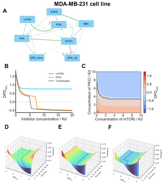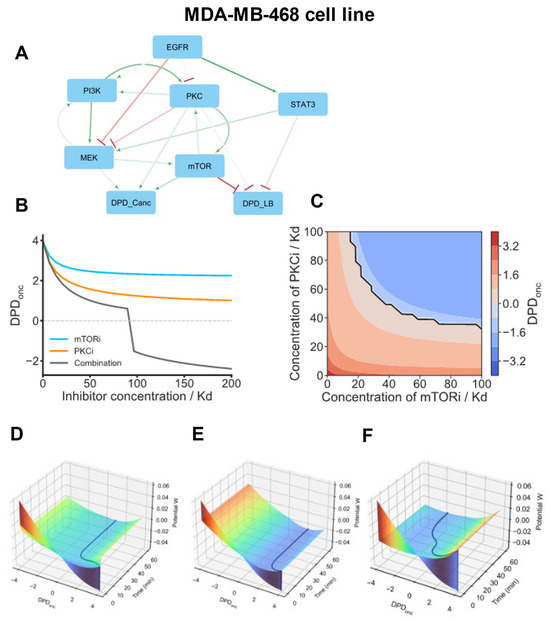 For the first basal subtype group, we focus on modeling the MDA-MB-468 cell line. The core network inferred for this cell line suggests that mTOR is the main oncogenic driver in these cells, with PKC being a secondary driver, and MEK/ERK only weakly contributing to DPDonc (Figure 4A and SI file cSTAR_networks.zip). Importantly, PKC and mTOR form a mutual activation loop. Thus, being activated by EGFR-PI3K signaling, the mTOR-PKC pair self-amplifies its signaling, generating sustained activating signals for oncogenic transformation.