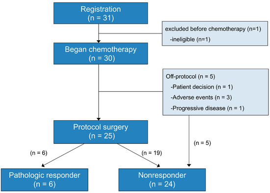 The study schema is shown in Figure 1. Of the 30 patients in the study, 25 (83.3%) underwent the protocol surgical resection after neoadjuvant treatment; 5 (16.7%) did not undergo surgery.