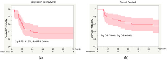 Unless otherwise stated, we calculated the data as either a number and percentage or a median and range. We used the chi-square test to compare frequencies of categorical variables and Fisher’s exact test for small samples. To compare continuous variables, we applied t tests and the Mann–Whitney U test. We defined progression-free survival (PFS) as the time from the day of registration to either the first event (disease progression in patients who did not undergo surgery, postoperative recurrence, or death from any cause) or the last follow-up visit. We defined OS as the time from the day of registration to either death from any cause or the last follow-up visit. To analyze the durations of both PFS and OS, we applied the Kaplan–Meier method, and to assess differences, we used the log-rank test. A p value of <0.05 indicated statistical significance. To analyze the data, we used JMP 15.0 (SAS Institute, Cary, NC, USA).