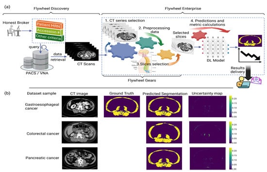 (a) Automated pipeline for skeletal muscle segmentation built on Flywheel platform. Processing inside Flywheel Enterprise is undertaken through scripts called “gears”. The data import from PACS/VNA is a manual process. Once the data are imported on Flywheel, the gears start running automatically in a sequence to perform the various tasks: (1) extract the required axial series; (2) data preprocessing; (3) identification of slices corresponding to each vertebra level; (4) slices fed to the trained deep learning model to output the segmented skeletal muscle, along with an uncertainty map that depicts the model confidence. This automated pipeline supports a longitudinal study of patients’ SMI (cm2/m2) for end users within Moffitt Cancer Center. (b) Sample slices at mid-L3 level representative of each dataset of gastroesophageal, colorectal, and pancreatic cancers. In this model, ground truth represents segmentation outputs from the widely validated Sliceomatic Software. The deep learning model output includes the predicted segmentation mask and the uncertainty map depicting the model confidence.