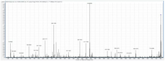 BLAST reveals that this sequence is found within fibrinogen alpha chain (FGA) isomer 2, as well as within an un-named protein product (BAF83248.1). To confirm this sequence, we used the Fragment Ion Formula Calculator to provide a list of the expected b and y ion series that are expected in the ms/ms spectra of FGA (Table 4). These predicted ion series are all present in the fragmentation profile of m/z 761.38.