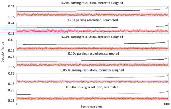 We processed the mass spectra from the 39 validation samples using machine learning-based COMPASS software, version 1.1. This allows comparative analysis of the entire MS1 scan data from every subject. We performed comparison based on early and late-stage classification, as for the study performed using a standard workflow. During parsing, in which data are extracted from the mass spec image, we set the COMPASS datapoint size parameters at 40 s on the retention time axis and 0.2 (initial), 0.1 (medium), or 0.05 (High) Da in the m/z axis. This yielded 684,843, 1,328,207, or 2,540,403 datapoints for analysis at each respective resolution after those containing no mass spec information were discarded. Ranking these datapoints by decision value (DV), an algorithm that measures the separation of values within a datapoint in relation to the biological classification, yields scores with a maximum of 0.79 and 257 datapoints with a score above 0.6 for the initial resolution. Slightly better DV scores are achieved as the resolution is increased, but the number of datapoints with scores above 0.6 increases more dramatically, to 439 at medium resolution and 560 at high resolution. Since no datapoint exhibited DV scores of 1 or greater, it means that there is an overlap of datapoint values when the values are separated by early and late-stage categories. Nonetheless, these DV scores far exceed what can be achieved when the values for the same datapoints are not correctly matched to categories (Figure 2).