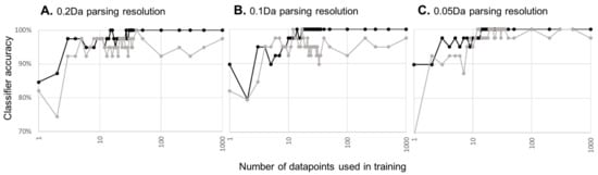 Machine learning accuracy as a function of the amount of training data. Black lines and points indicate machine learning accuracy with correctly assigned data, while grey lines indicate machine learning accuracy derived from the mock dataset. Graphs are for machine learning applied to datapoints generated at 0.2 (A), 0.1 (B), or 0.05 Da (C) parsing resolution along the m/z axis of the mass spec image.