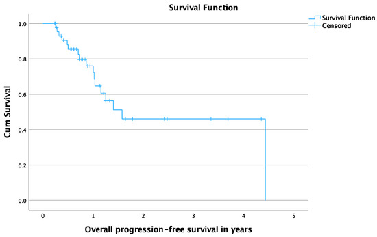The mean OS time was 4.13 years (95% CI: 3.7–4.5), as shown in Figure 2. The death of two patients was reported during the follow-up period due to ETP.