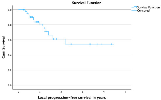 Additionally, the mean overall PFS time was 2.5 years (95% CI: 1.8–3.2) and the mean local PFS time was 2.9 years (95% CI: 2.3–3.6). The 6- and 12-month overall PFS rates were 85.4% and 72.3%, respectively. The 6- and 12-month local PFS rates were 90% and 80%, respectively. Figure 3 and Figure 4 show the Kaplan-Meier curves of overall PFS and local PFS, respectively. A summary of the patients’ outcome can be seen in Table 3.