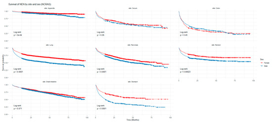 Kaplan–Meier graph for patients with NENs in the SEER cohort (classified by site and sex). The shown p-value is for the difference in survival between males and females for each anatomical site using a log-rank test (not age-adjusted).