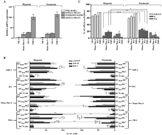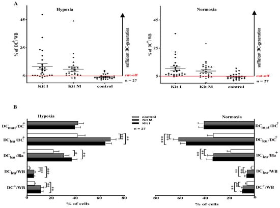 Whole blood contains all soluble and cellular factors present in the individual AML patient, which may have activating or inhibitory influences on physiological immune reactions [19]. Therefore, we generated DC/DCleu directly from healthy and leukemic WB to simulate most physiological conditions. DC/DCleu generation was feasible under both hypoxic and normoxic conditions and the DCleu subgroups did not significantly differ between the two conditions. Importantly, the used Kits did not induce blasts’ proliferation during cultures, thereby conforming previous findings. In the clinical context, these results support the idea that AML patients could be treated directly with Kits inducing DC/DCleu-generation in vivo [48,49].