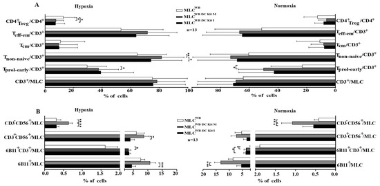 T, iNKT, NK and CIK cells and their subsets are important mediators of innate and adaptive immune responses and their anti-tumor and anti-infections functionality are known to be activated by DC/DCleu [15]. This was already confirmed previously under normoxic conditions using DC/DCleu generated with Kits in T cell enriched MLC [9,14,15,30,50]. We can add that this activation was seen under hypoxic as well as normoxic conditions and resulted in comparable frequencies of different immune cell subsets. Memory T cells play a critical role in the maintenance of the complete remission of AML patients if activated in vivo [51,52]. Furthermore, cells of the innate immunity significantly increased after MLC under hypoxic and normoxic conditions.