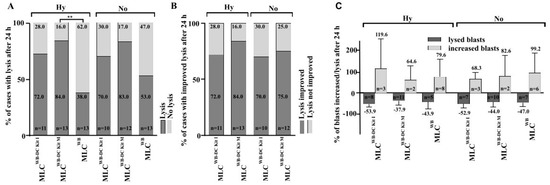 Achieved blast lysis after MLCWB-DC Kit I, MLCWB-DC Kit M and MLCWB (control) after 24 h of co-cultures with leukemic blats (target cells). Percentage of cases with lysis after 24 h (Figure 5A), percentage of cases with improved lysis after 24 h (Figure 5B) and percentage of blasts increased/lysed after 24 h (Figure 5C) under hypoxic and normoxic conditions are presented.