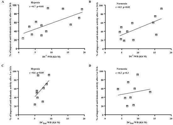 We investigated the correlation between the anti-leukemic reactivity of effector cells (T cell-enriched WB treated with or without Kits) and the frequencies of various DC and immune cell subtypes. In normoxic conditions, a significant positive correlation was found between DC+/WB generated with Kit M and the highest anti-leukemic activity after 3 or 24 h of treatment with MLCWB-DC Kit M. Under hypoxic conditions, a significant correlation was observed between DC+/WB and DCleu/WB generated with Kit M and the most effective anti-leukemic reactivity of T effector cells after MLCWB-DC Kit M after 3 or 24 h. Other cell subtypes did not show a direct correlation with achieved cytotoxicity. These findings support previous studies indicating a relationship between DC stimulation and the gained cytotoxicity of stimulated T cells against leukemia [55]. Moreover, the better anti-leukemic reactivity of MLCWB-DC Kit M compared to MLCWB could be a good explanation for the positive correlation between (DCleu/WB) generated with Kit M and the best anti-leukemic activity of T cells (MLCWB-DC Kit M) in hypoxic conditions.