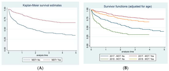 Reggio Emilia Cancer Registry, years 2017–2018. Kaplan–Maier curve of overall survival by MDT (A) and year of diagnosis (B) adjusted for age.