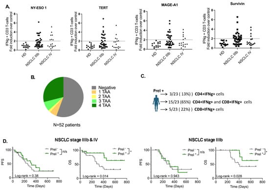 To access the levels of circulating TAA-reactive T cells in NSCLC patients, we performed co-cultures of PBMCs with peptide mixes against four different, highly relevant to NSCLC, TAAs called TERT, MAGEA1, Survivin, and NY-ESO-1. For positive controls, patients’ PBMCs were cultured with SEB, while for negative controls, DMSO was used. To set up the cutoffs, co-cultures with matched healthy donor PBMCs were performed (Figure 1A and Figure S2). Based on the detection of IFNγ-expressing T cells against the peptides from any TAA, 44% (23/52) of the patients were considered to have PreI+, whereas, no IFNγ-expressing T cells against the same antigens could be revealed in the remaining 29 patients (56%; PreI) (Figure 1A,B).