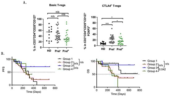 The correlation of different immunosuppressive phenotypes, grouped into high and low, with survival outcomes did not reveal any significant difference (Table 4). As PreI+ patients were found to have lower percentages of CTLA-4 Tregs in circulation, we next grouped the patients as follows: Group 1: High CTLA-4 Tregs with PreI+ (n = 13), Group 2: High CTLA-4 Tregs with PreI (n = 21), Group 3: Low CTLA-4 Tregs with PreI+ (n = 9), and Group 4: Low CTLA-4 Tregs with PreI (n = 9). Kaplan-Mayer curves indicated a significant overall survival benefit in patients in group 3 compared to patients in group 4 (p = 0.042, med: undefined vs. 284 days, HR 0.14) but not PFS (p = 0.562) (Figure 3B).