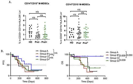 Additionally, the patients were also grouped according to high or low percentages of CD14+CD15+ M-MDSCs and their pre-existing immunity T cell status as follows: Group A: High M-MDSCs with PreI+ (n = 10), Group B: High M-MDSCs with PreI (n = 9), Group C: Low M-MDSCs with PreI+ (n = 12), and Group D: Low M-MDSCs with PreI (n = 19). Survival analysis revealed a significant benefit in patients with PreI+ harboring low levels of M-MDSCs (Group C) compared to the other three groups (Group C vs. Group A: p = 0.050, med: undefined vs. 411 days, HR0.16; Group C vs. Group B: p = 0.009, med: undefined vs. 321 days, HR 0.10; Group C vs. Group D: p = 0.039, med: undefined vs. 329 days, HR 0.25) (Figure 4B).