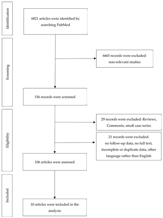 A total of 6821 articles were initially identified. Of these, 6665 non-relevant studies were excluded. The full-text evaluation of 156 records yielded 10 eligible articles according to the inclusion and exclusion criteria outlined earlier (Figure 1). The 10 articles cover a total of 6859 tumors treated with MMS and 5048 tumors treated with conventional excisions (in some cases with additional margin control). With the exception of the two studies [11,12] mentioned in Table 1 (use of other techniques), treatment with MMS refers to the “classical” method (bowl-shaped excision, cryostat sectioning), as widely practiced in the USA and Europe and described, for example, in the position paper of the ESMS (European Society for Micrographic Surgery) [13]. According to the established criteria, we did not identify any studies on other variants of micrographic surgery, such as the Munich method (cylindrical excision), the margin strip method (“Tübinger Torte”), and the muffin technique (en bloc excision, separation of margins and base from the unfixed or fixed specimen) [13]. The selected articles are summarized in Table 1 and the main points are discussed there.