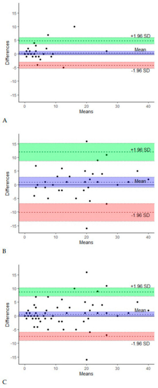Bland–Altman plots of test and retest in group 0 (A), group 1 (B), and both groups combined (C).