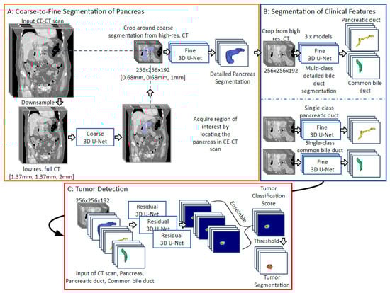 We developed an AI system designed to detect pancreatic cancer, aiding clinicians in early diagnosis with clinically interpretable results. Therefore, we made use of secondary signs (such as duct dilatation) to enhance interpretability. A “multi-stage coarse-to-fine” framework was developed that divides the detection process into multiple steps, where each step progressively refines the detection accuracy, starting from a coarse level of analysis and gradually refining to more detail. This approach consists of (1) an initial pancreas localization model, (2) a fine pancreas segmentation model, (3) a common bile duct and pancreatic duct segmentation model, and (4) a final tumor detection model that employs these predicted features in the tumor segmentation algorithm. First, the coarse segmentation of the pancreas was carried out in a downsampled full-image CT scan. The segmentation of the pancreas was accomplished using a coarse-to-fine 3D U-Net-based approach. Initially, a coarse model processed full-image CT scans, which were resampled to twice (1.37 mm, 1.37 mm, and 2 mm) the target resolution (0.68 mm, 0.68 mm, and 1 mm). This model employed a patch-based strategy, utilizing patches sized at 128 × 128 × 64 voxels with a stride of 32 × 32 × 32 voxels. Subsequently, a fine segmentation model was applied to a high-resolution, cropped region (256 × 256 × 192 voxels) around the center of the pancreas, as determined from the coarse segmentation. The fine model, also based on a U-Net architecture, focused specifically on these cropped regions to enhance the precision of pancreatic segmentation. It employed the same patch size of 128 × 128 × 64 voxels and a stride of 32 × 32 × 32 voxels. Both the coarse and fine models consisted of a four-layer deep U-Net, with each layer containing 32, 64, 128, and 256 convolutional filters, respectively. However, they were trained on data of different resolutions to optimize their performance at the stage in the processing chain. The ductal segmentation models were also applied to the high-resolution crop around the pancreas. These segmentation models similarly used a patch-based 3D U-Net model trained on the cropped region of the CT scan. We used a 3D U-Net-like deep CNN due to its specific applicability to medical segmentation [15]. The models segmented patches of size 128 × 128 × 128 pixels at a stride of 32 × 32 × 32 pixels. The tumor segmentation model took the full CT crop (256 × 256 × 192) along with the segmentations of the previously extracted anatomical features as input. Thus, the model had a large receptive field, enabling it to consider aspects such as the ductal size (potential dilation) in the context of the pancreas and the CT crop, allowing for maximally informed tumor predictions. Since we provided the segmentation of the pancreas and ducts as input to the detection model, the model was trained to utilize any valuable feature from these segmentations. Therefore, the model potentially also included other secondary features such as atrophic pancreas, ductal interruption, and peri-pancreatic infiltration. The complete workflow is shown in Figure 1 and Figure 2.