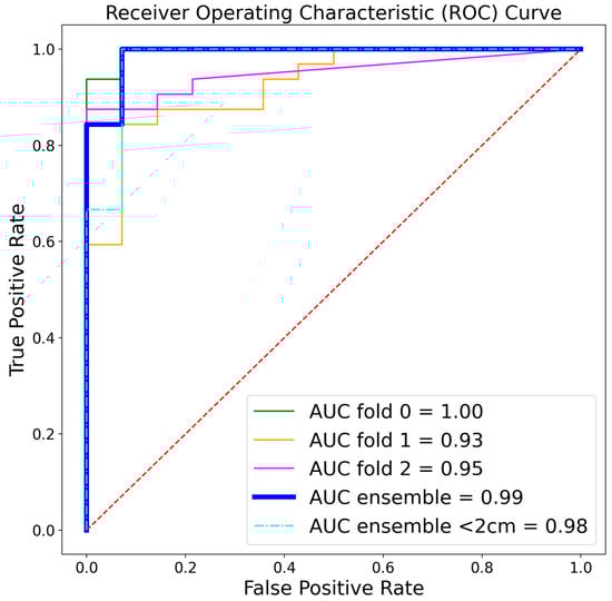 All models were applied to the internal test set and the MSD dataset as test sets. Utilizing ground-truth annotations of the pancreas and ducts as input, the tumor detection model demonstrated perfect accuracy in identifying tumors within the internal test set, resulting in a sensitivity of 1.00 (Table 3). The tumor detection model achieved a specificity of 0.86 on the internal test set. Combining the three different models improved performance with no false-positive predictions, resulting in a perfect 1.00 sensitivity and specificity. Utilizing the multi-stage algorithm where the pancreas, common bile duct, and pancreatic duct were automatically segmented and provided to the tumor detection model, the specificity dropped to 0.64 ± 0.15. However, combining the different models improved the overall performance to a sensitivity of 0.97 (1 case missed) and a specificity of 1.0. Overall, the models displayed accurate tumor detection results, with an AUROC of 0.99. In a subanalysis of tumors smaller than 2 cm within the internal test set (12 cases < 2 cm vs. control set), the model achieved an impressive AUROC of 0.98. However, it also recorded a much lower DSC of 0.19 ± 0.24, which highlights the challenge of accurately delineating these small tumors (Figure 3).