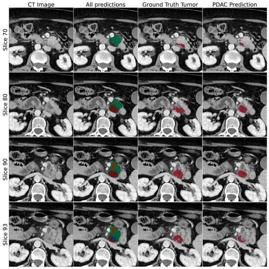 This figure shows examples of CT images, included with predicted segmentations of the proposed tumor detection framework. CT scans are in the parenchyma phase. The tumor is depicted in red, the pancreas in green, the pancreatic duct in orange, and the common bile duct in blue. The ground-truth tumor and tumor prediction are depicted in consecutive columns. In this case, the model achieved a DICE score of 0.71 on an image from the test set.