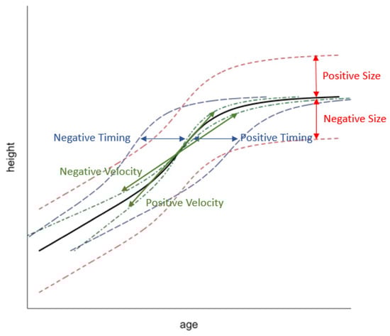 Illustration of the SITAR model for height in puberty taken from Cole et al., 2010 [37]. The solid line is the mean growth curve; the short dashed red lines indicate a vertical or height shift in the curve corresponding to the size parameter value, whereby a negative size value indicates size lower than the mean; the long dashed blue lines indicates a horizontal or age shift corresponding to the timing parameter value for age at peak growth velocity (APV) and indicates whether an individual reached their APV at an earlier or later (age) than average (negative timing means earlier than the mean) and the dot-dashed green lines represent a shrinking–stretching of the age scale reflecting velocity parameter value relating to the peak growth velocity (PV), which indicates whether an individual has a shorter or longer growth spurt compared with the population mean (negative velocity means a longer growth spurt than the mean).