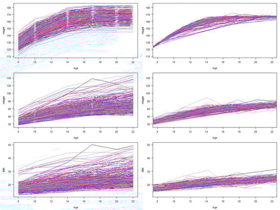 Plots showing the raw growth curve plots for height, weight and BMI (y-axis) against age (x-axis) on the left. The plots on the right show the fitted growth curves after the SITAR modelling (n = 453).