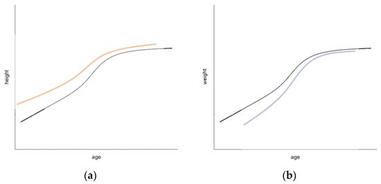 Descriptive curve (not to scale) of height growth during adolescence associated with higher breast density compared to the mean (a); descriptive curve (not to scale) of weight growth during adolescence associated with higher breast density compared to the mean (b).