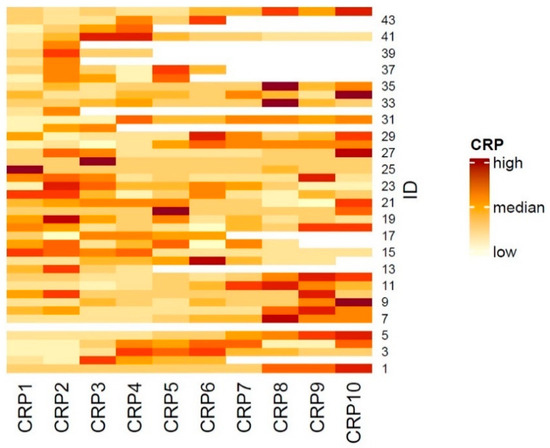 The median baseline concentration at the start of CPI therapy (CRP1) is 17.75 mg/L (IQR 43.25 mg/L, 0–118 mg/L). Figure 1 shows a heat map of the dynamics of the CRP concentration over the course of the first nine CRP measurements (CRP2–CRP10), measured before each of the first 10 doses of immunotherapy.