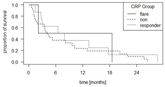 Based on the CRP group definitions of Fukuda et al. [7], there are 5 patients (11%) with flare dynamics, 11 patients (25%) with responder dynamics and 28 patients (64%) with non-responder dynamics. There are no significant survival differences in the logrank test (p = 0.7). The corresponding survival curves are shown in Figure 2.
