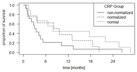Based on the CRP group definitions of Ishihara et al. [13], there are 16 patients (36%) with “normal” dynamics, 13 patients (30%) with “normalized” dynamics and 15 patients (34%) with “non-normalized” dynamics. There are also no significant survival differences in the logrank test (p = 0.2). The corresponding survival curves are shown in Figure 3. The combination of “normal” and “normalized” vs. the “non-normalized” group also failed to reach the significance level (p = 0.1).