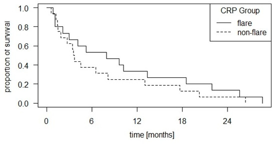 The term “CRP flare” is not universally defined. In 2021, Fukuda et al. formulated the above definition for the groups “responder”, “non-responder” and “flare”. Based on this definition, there were no significant group differences in OS in our patient population and, accordingly, no prognostic value of CRP kinetic. In particular, the definition by Fukuda et al. that the CRP concentration must fall below the baseline after 3 months in the case of flare dynamics complicates the evaluation in our patient group, as 13 patients (29%) already had normal CRP levels at the start of treatment. These patients were, therefore, already excluded from the definition of a flare responder or a responder.