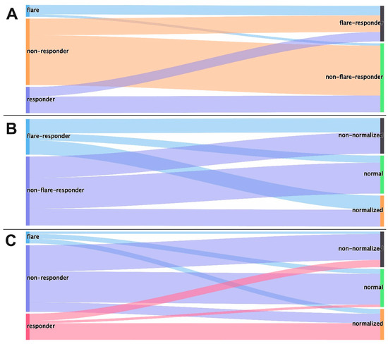 Figure 5 shows a Sankey diagram comparing the assignments of the various CRP kinetic groups. It can be seen that the assignment to the groups that were assessed as prognostically favorable in the individual studies (“flare” and “responder” in the definition of Fukuda et al., “normal” and “normalized” in the definition of Ishihara et al. and “flare-responder” in our definition) shows some overlaps, but that there are also relevant divergences in the classification and interpretation.