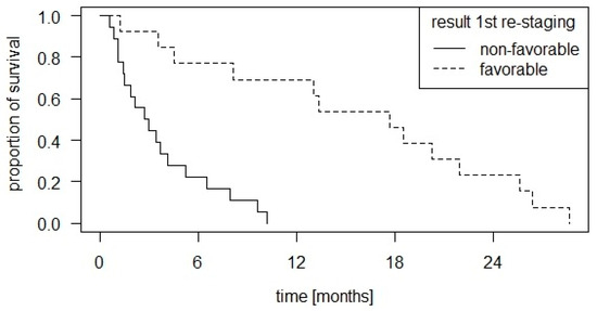 As expected, there is a significant correlation between the result of the first re-staging after 12 weeks and OS in favor of favorable re-staging results (p < 0.001). The survival curves are shown in Figure 6.