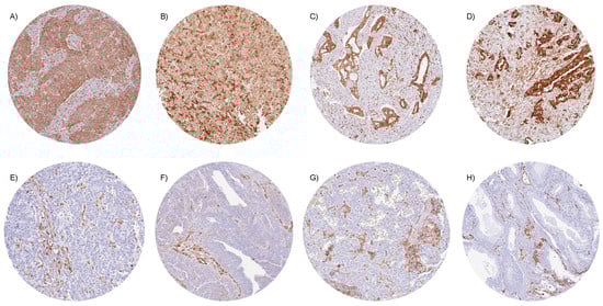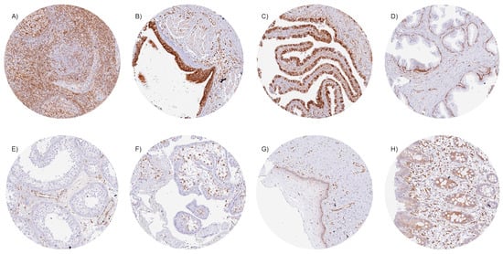 Two sets of TMAs made from formalin-fixed, paraffin-embedded tissue samples were employed in our study. These included a normal TMA with a total of 608 samples that was built from 8 samples (from 8 different donors) from each of 76 different normal tissue types, as well as cancer TMAs. The cancer TMAs included a total of 18,001 primary tumors from 139 different tumor types and subtypes. The TMAs contained one 0.6 mm spot per tumor and were manufactured as described earlier [,]. A histopathological and molecular database was attached to the TMAs containing data of cancers of the breast (n = 1208), kidney (n = 1534), liver (n = 231), bladder (n = 1073), thyroid (n = 518), colon (n = 2351), pancreas (n = 598), stomach (n = 327), endometrium (n = 182), and ovary (n = 369). Clinical follow-up data were available from 877 patients with invasive breast carcinomas of no special type with a median follow-up time of 43 months. From an earlier study, data on PD-L1 expression were available for 11,938 cancers and on the density of CD8-positive lymphocytes for 6,897 cancers []. Details on the normal tissues and cancers represented in the TMAs are given in Section 3. All samples were obtained from the routine archives of the Institute of Pathology, University Hospital of Hamburg, Germany; the Institute of Pathology, Clinical Center Osnabrueck, Germany; and the Department of Pathology, Academic Hospital Fuerth, Germany. The use of archived remnants of diagnostic tissues for TMA manufacturing, their analysis for research purposes, and the use of patient data complied with local laws (HmbKHG, §12) and analysis had been approved by the local ethics committee (Ethics commission Hamburg, WF-049/09). All work has been carried out in compliance with the Declaration of Helsinki.