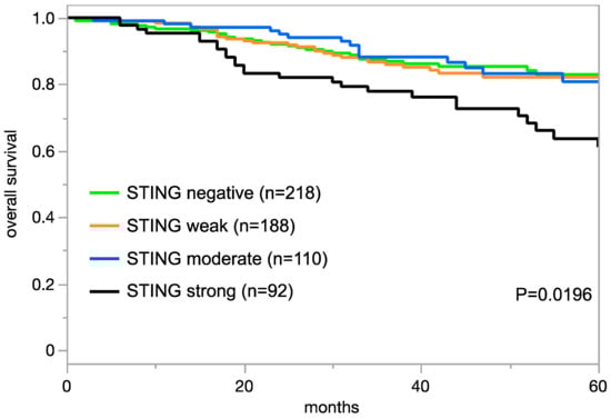 Most available data on STING expression in cancer are RNA-based and, therefore, cannot distinguish the specific role of STING expression in cancer cells. Studies evaluating STING expression of tumor cells by immunohistochemistry (IHC) are so far limited in number and the obtained results suggest a rather complex and variable role of STING expression in cancer. For example, STING downregulation as compared to adjacent normal tissue has been reported in colorectal [] and gastric carcinomas [], while STING upregulation, as compared to adjacent normal tissue, was described in squamous cell carcinomas (SQCC) of the tongue []. Associations of high STING levels with unfavorable tumor features were found in carcinomas of the cervix uteri [], ovary [], stomach [], colon [], lung [], larynx [] tongue [], and kidney [], while low STING levels were related to unfavorable tumor features in carcinomas of the breast [], head and neck [], the urinary tract [], lung [,], and stomach [], as well as in T-cell lymphoma [].