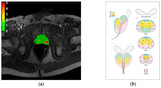 (a) Example of MRDI map; (b) sector map of PIRADS 2.0 used for scoring.