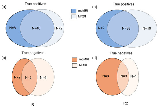 Schematic representation comparing the performance of mpMRI and MRDI. (a,b) represents the true positives found by mpMRI alone (dark blue), MRDI alone (light blue) and both MRDI and mpMRI (MRDI ∩ mpMRI, mid-tone blue) for radiologists 1 and 2, respectively; (c,d) represents the true negatives found by mpMRI alone (dark orange), MRDI alone (light orange) and both MRDI and mpMRI (MRDI ∩ mpMRI, mid-tone orange) for radiologists 1 and 2, respectively.