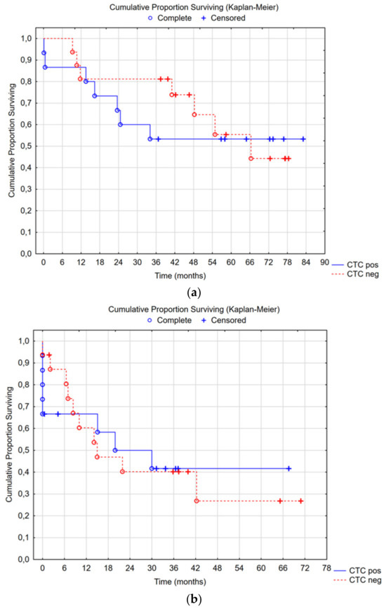 (a) Median overall survival in the CTC-positive group was not reached, with a 5-year survival rate of 53%; in the CTC-negative group, the median overall survival was 66 months (95% CI 34—not reached) with a 5-year survival rate of 55%, Cox’s F-test p = 0.355. (b) Median recurrence-free survival in the CTC-positive group was 20 months (95% CI 8—not reached), and in the CTC-negative group, it was 15 months (95% CI 8—not reached), Cox’s F-test p = 0.383.