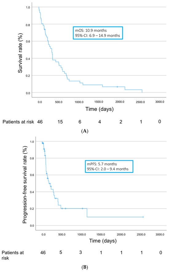 Altogether, patients showed a median overall survival (mOS) of 10.9 months (95% confidence interval (95% CI) 6.9–14.9 months) and a median progression-free survival (mPFS) of 5.7 months (95% CI 2.0–9.4 months) from treatment initiation (Figure 2). Median time to progression (TTP) was 3.5 months (range 1.1–38 months). Treatment with TKIs achieved a disease control rate (DCR) of 17.4%. Twenty-three patients (50%) showed progressive disease as best response on TKIs. In 15 patients (32.6%), response could not be assessed, in most cases due to early discontinuation of treatment as a result of adverse events or death of the patient (Table 3).