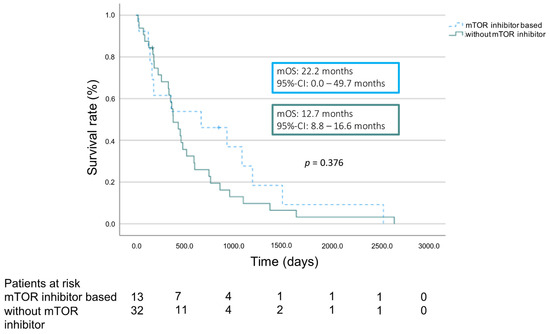We compared the overall survival of patients who were already immunosuppressed by a mTOR inhibitor before the recurrence of HCC was diagnosed with those patients whose immunosuppression did not contain a mTOR inhibitor before detection of recurrence. mOS from the detection of recurrence was 22.2 months (95% CI 0.0–49.7 months) in the group of patients with mTOR inhibitor. Patients in the cohort without mTOR inhibitor showed a mOS of 12.7 month (95% CI 8.8–16.6 months, p = 0.376) (Figure 3).