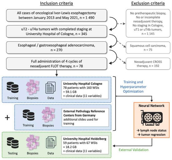 Eligible subjects of this study were patients with esophageal or gastroesophageal junction adenocarcinoma who underwent abdominothoracic Ivor-Lewis esophagectomy with gastric tube reconstruction between January 2013 and May 2021 at the University Hospital of Cologne, Department of General Surgery (see Figure 1). To be considered for this retrospective analysis, only cases with full administration of four cycles of preoperative FLOT therapy and a complete histopathological workup after resection were included. Tumors that were staged as uT1 early cancer or uT4b were excluded from analysis. Furthermore, the developed algorithm was validated using an external validation cohort from the University Hospital of Heidelberg, Department of General Surgery, that met the same inclusion criteria.
