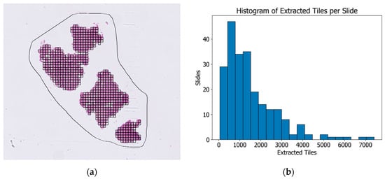 All slides were manually annotated by defining the region of interest (ROI) encircling the tumor area on the WSIs with biopsy tissue. The annotations were performed using QuPath 0.5.1 [13] and additional scripts for automatization. The Libvips library was used to process the images outside of QuPath. The automated preprocessing of regions before training included Macenko stain normalization [14], tiling the regions into a tile size of 299 pixels/100 µm, a gray-space fraction of 0.6 and a threshold of 0.05, a white-space fraction of 1.0 and a threshold of 230, and additional Otsu thresholding [15] for background exclusion. Figure 2a shows an example biopsy with the marked region of interest (ROI) and the resulting tessellation into 617 training tiles, whereas Figure 2b demonstrates the distribution of the amount of extracted tiles for the whole cohort, resulting in the total number of 342,545 tiles.