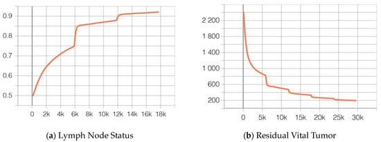 The neural network introduced in Section 2.6 (see above) was trained to separately classify tiles, slides, and patients only from the Cologne group into the binary outcome parameter positive or negative lymph nodes (ypN0 vs. ypN+) extracted from the final histopathological workup. At the beginning of training, the accuracy was calculated as 49.7% and reached 92.1% after 17,793 batches and 3 epochs (see Figure 3a). Likewise, the loss function started at 1.071 and reached 0.201 at the end of training. Residual vital tumor (RVT) was predicted using the mean squared error (MSE) as the loss function for training. The MSE started with values above 2200 and decreased after 29,655 batches and 5 epochs to 197.2, resulting in an error of ±14.1% for predicting the true percentage of RVT (see Figure 3b). For both models, the ideal batch size was determined as 48 after hyperparameter optimization and each epoch contained 5931 batches.