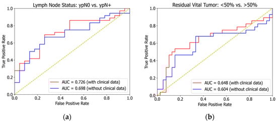 External validation with an area under the curve (AUC) of 0.726 for the binary classification of negative lymph nodes ypN0 vs. any positive lymph nodes ypN+ in the final histology (red curve (a)) compared to 0.698 when trained without clinical data (blue curve (a)). The AUCs for binarily classifying major responders with a residual vital tumor of <50% vs. minor responders with a residual vital tumor >50% were 0.648 (red curve (b)) and 0.604 (blue curve (b)) when trained without clinical data. The diagonal yellow line demonstrates a random prediction with an AUC of 0.5.