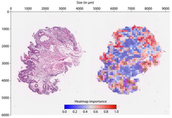 Normal H&E-stained, therapy-naïve histology slide and its correlating heatmap depicting the tiles with higher values close to 1.0 (marked in red) that were predictive for positive lymph nodes.